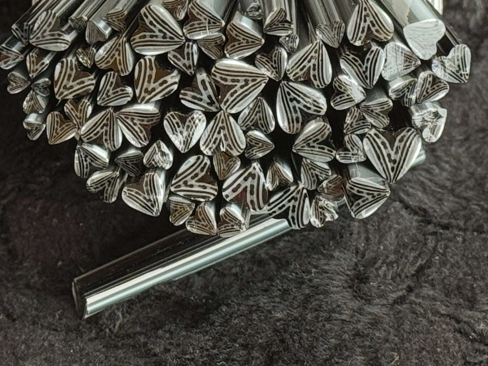 When I make tails for fish, I end up with extra heart-shaped canes that vary in size and make a great multi-size mix! When you put the points inward and group five hearts together, they make a lovely flower! They are a dark murrini, so the inner designs are present, but will be subtle in appearance. With a little dot placed in the center of a grouping of hearts, it makes a very formal looking flower. Great for weddings! Sizes in each package will be from larger to tiny. Because the "V" of the design has some clear in it, when fully fused it will retain a bit of a heart/scalloped shape (look at the fish tails in the sample of fully fused tests).