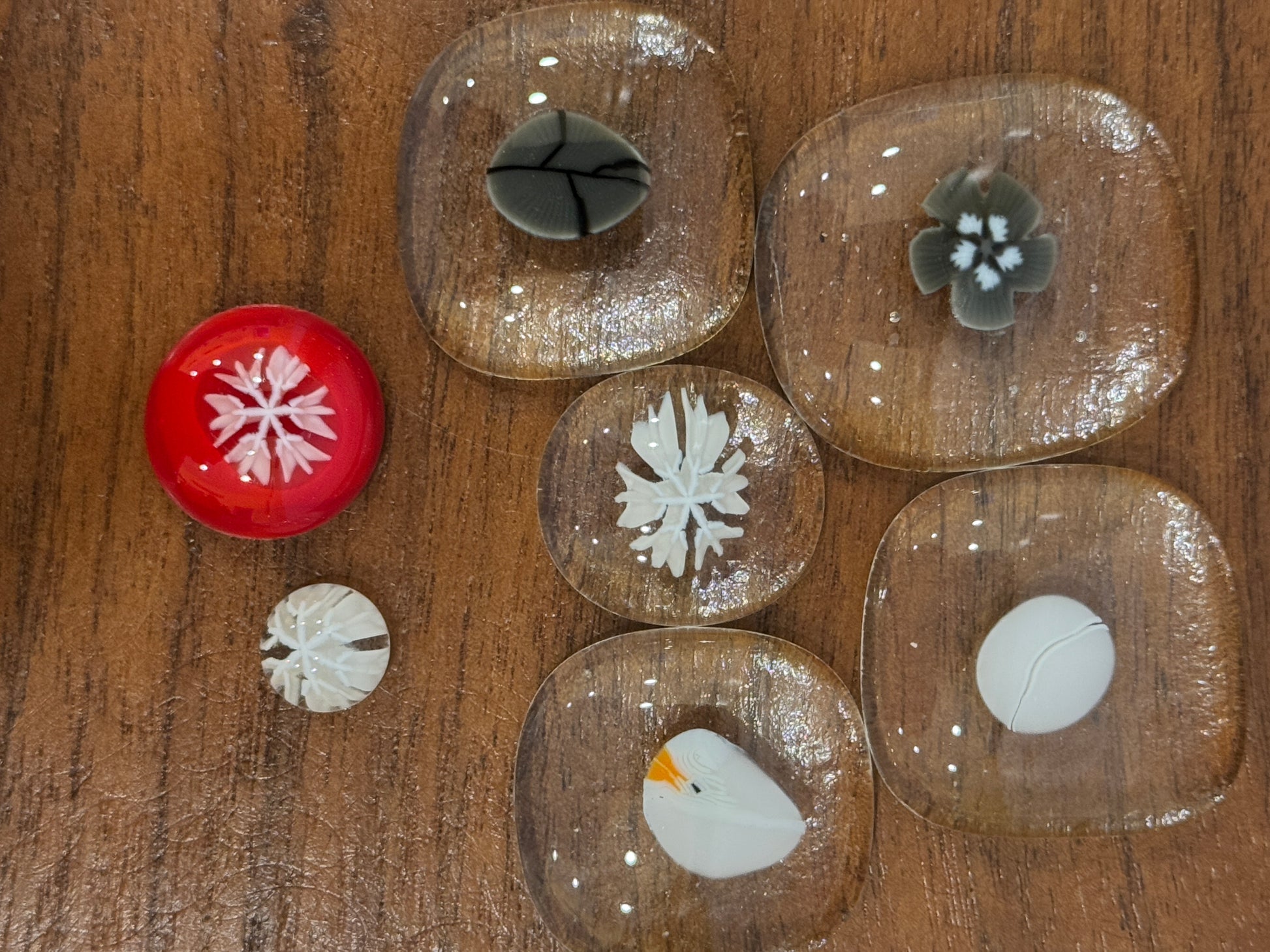 My listings are photographed in the best lighting possible to show accurate colors (however all computer monitors render colors differently). I use Oceanside fusible glass in my shop in my shop unless specified in the listing. COE 96. My murrini are hand pulled by me and are annealed and tested.