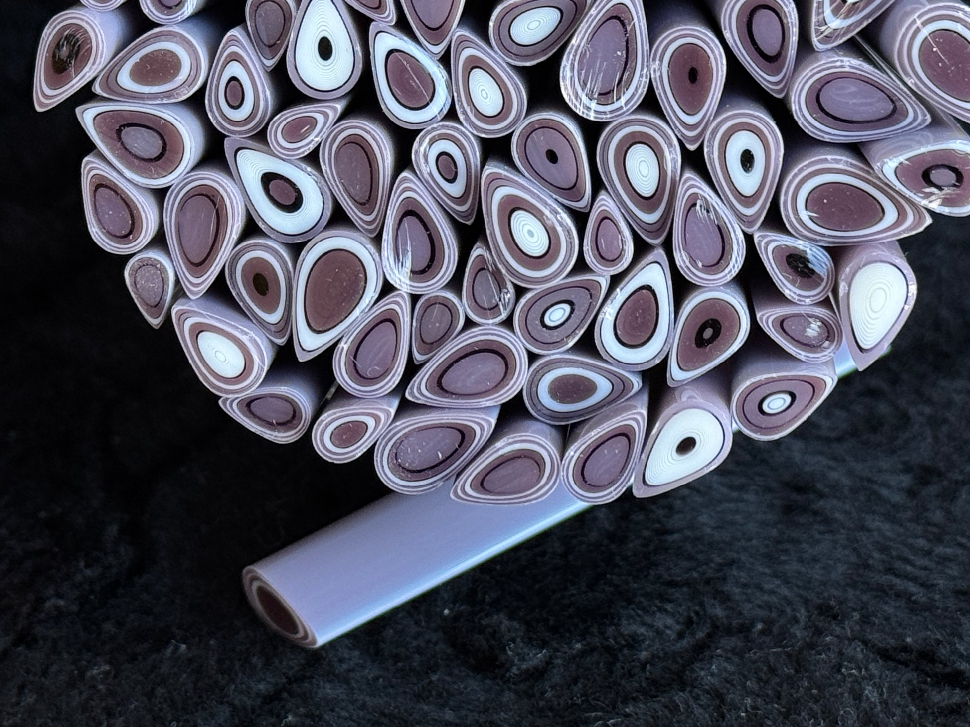 This listing is for 1.5oz. which will be 8-12 two-inch long canes. Once received, the cane can be snipped as thick or thin as you’d like. If snipped into 3mm chips, you will get approximately 15 pieces per cane. These murrini are great tack to fully fused.