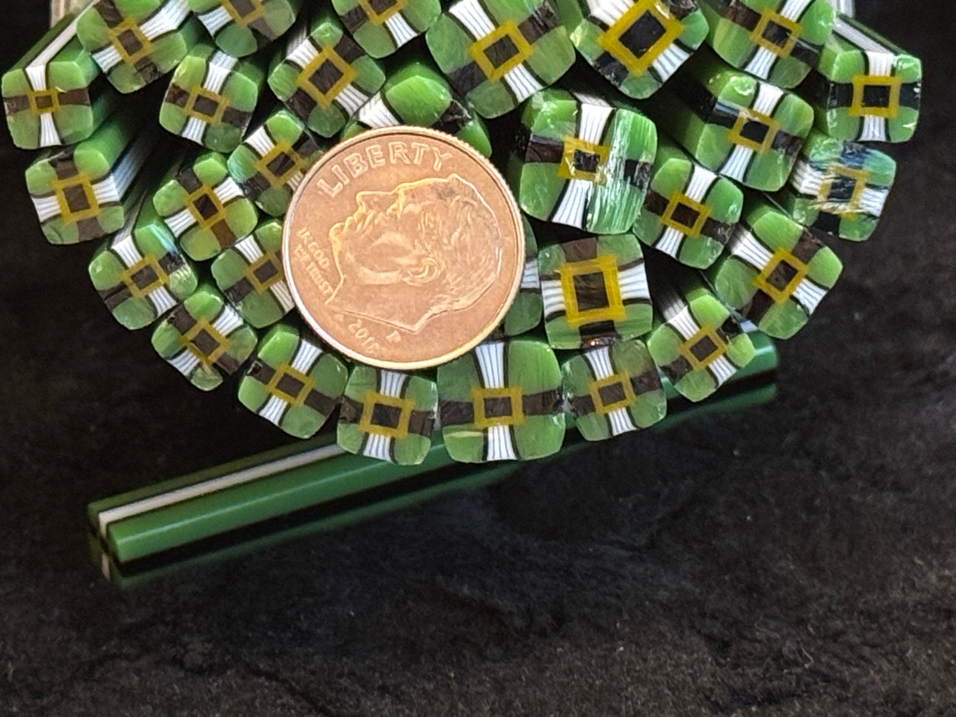 They were hand-pulled by me in my glass shop’s vitrigraph kiln, then fully annealed and tested. Sizes will vary in each 1.5+oz. order (see dime for size reference). There are 6-7 canes in each package.
