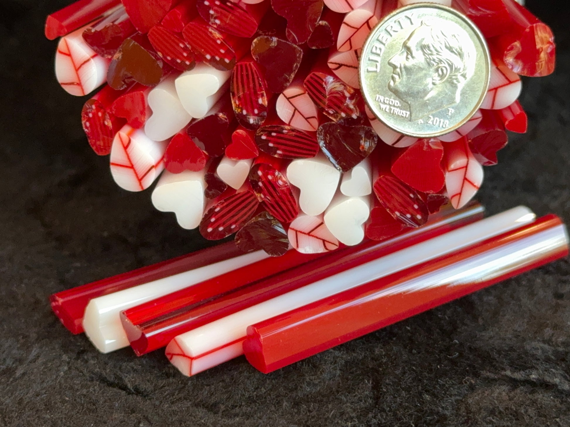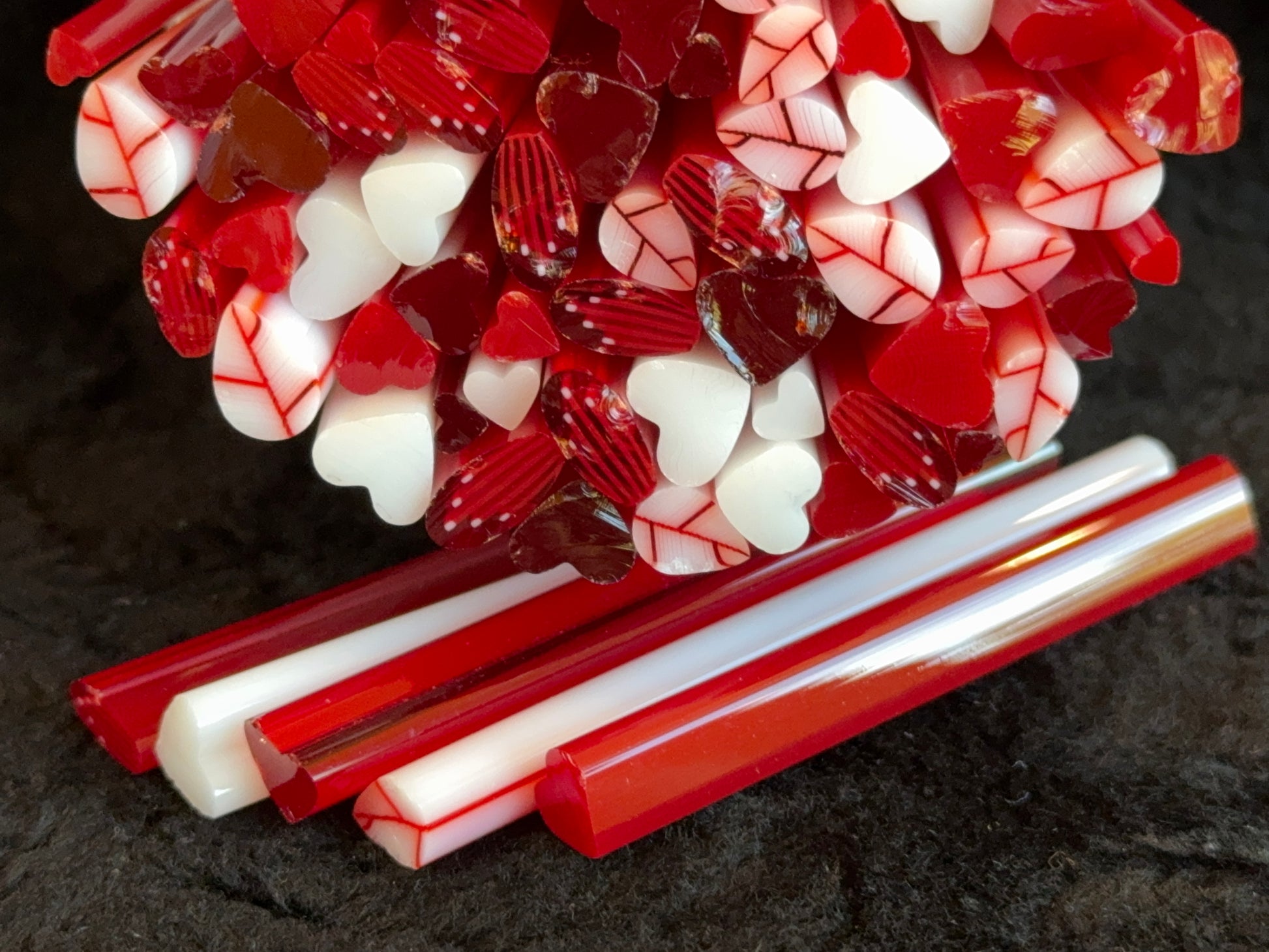 The Valentine Mix consists of 2 Artsy Red Veined Leaves, 2 Red Striped Flat-End Petals, and 3 each of the opal Red, Light Cherry Red transparent, and White opal hearts packaged as a fun multi-size variety. So you'll have 9 hearts ranging from tiny to large. In total, there are 13 canes in the 1.6+oz. Valentine mix.
