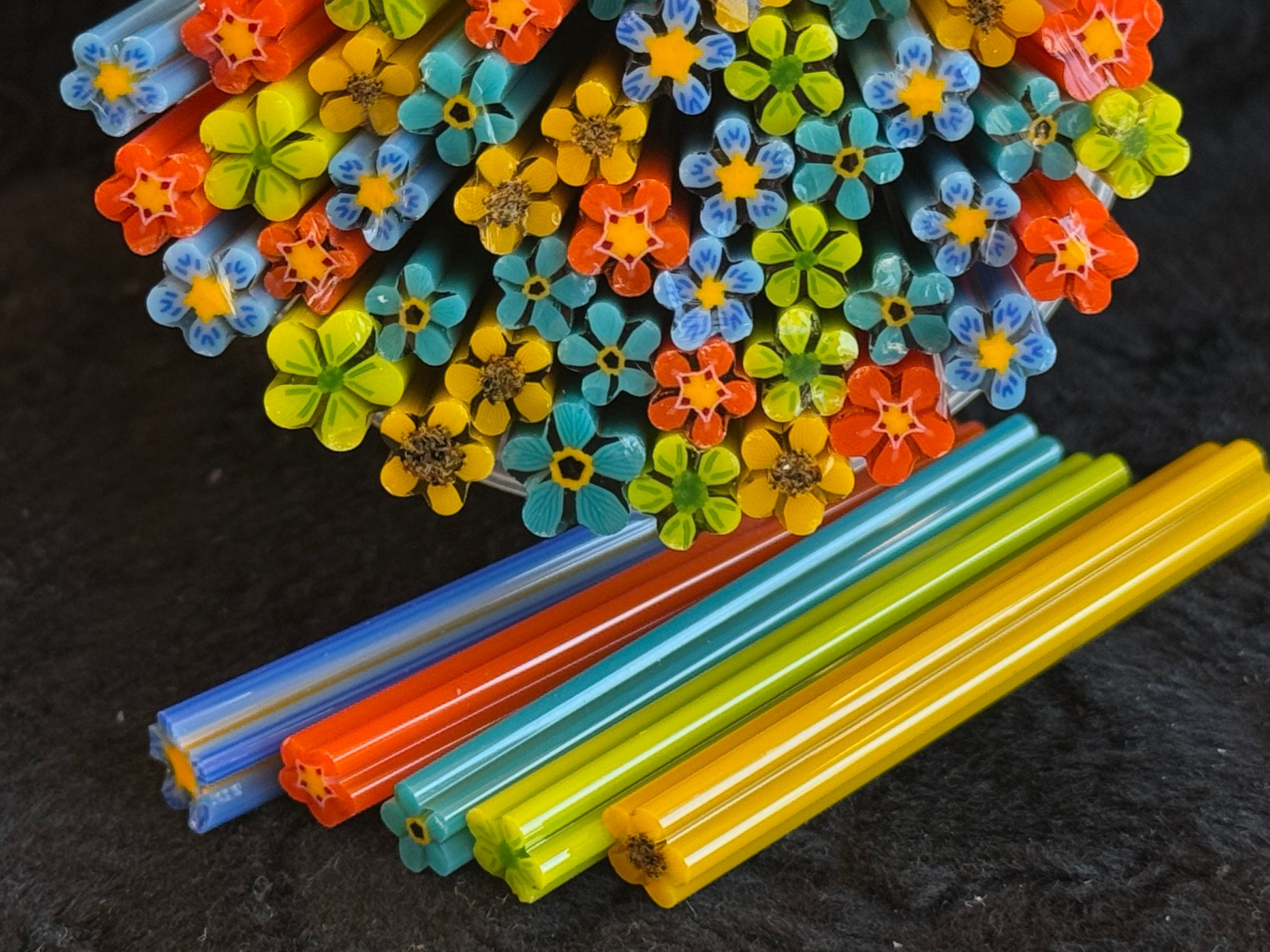 They were photographed in the best lighting possible to show accurate colors (however all computer monitors render colors differently). I use Oceanside fusible glass in my murrini unless otherwise specified in the listing. COE 96. See dime for size reference.