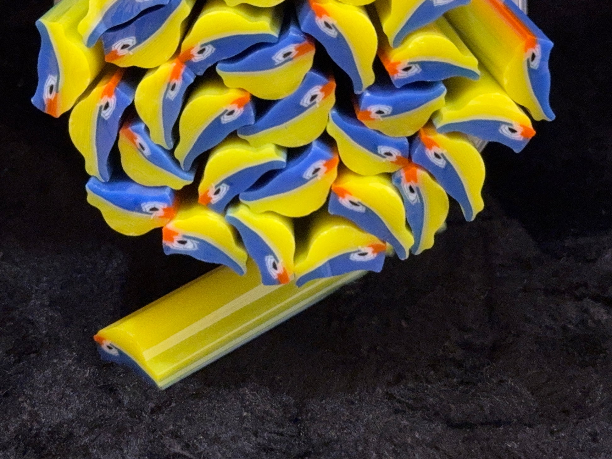 This adorable bird design was created by Lori Moreno from Wilderness Glass, who shared her design with me. They are the perfect touch when a little Bluebird is needed. TACK FUSE to keep the outer shape intact. This murrini will round out quickly, so a test fuse is recommended. Sizes in each package will vary.